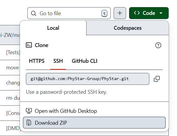 从PhyStar-Group的GitHub开发群组,并进入PhyStar仓库中,点击Code->Download ZIP 即可下载。